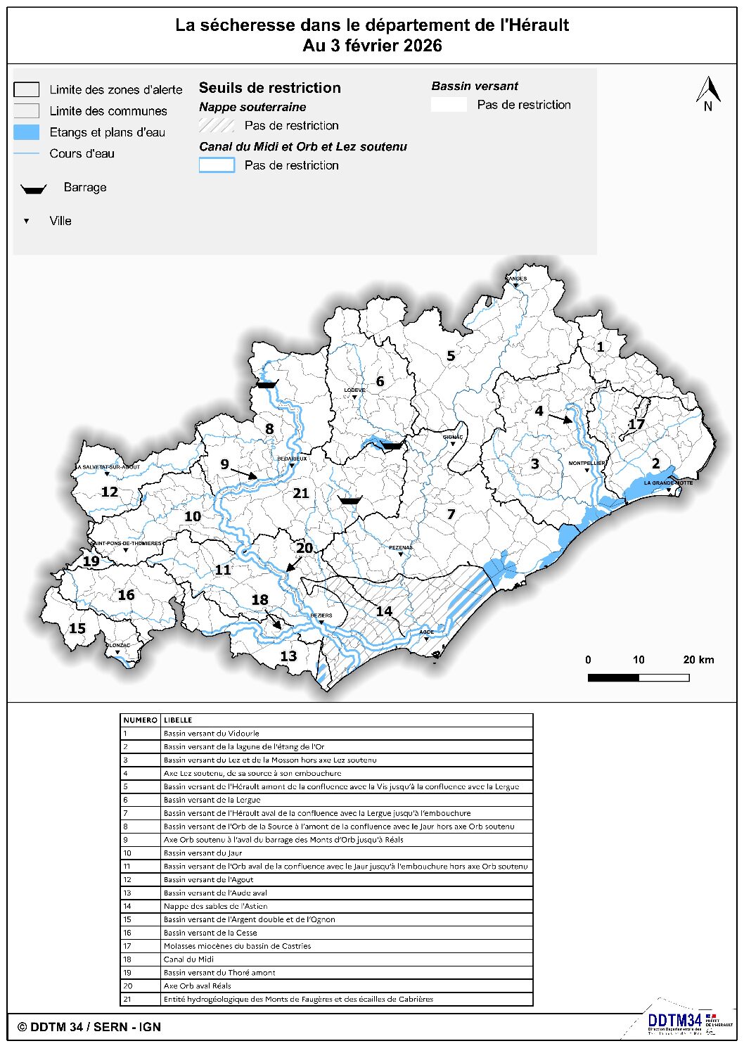 Pour plus d’information sur l’arrêté d’abrogation, vous pouvez vous rendre sur le site Internet des services de l’Etat, où vous trouverez le point de situation au 4 février 2026 (arrêté accompagné de la carte des zones d’alerte) et les documents de référence sur la sécheresse (dont arrêté cadre sécheresse DDTM34-2025-04-15839 du 22 avril 2025).