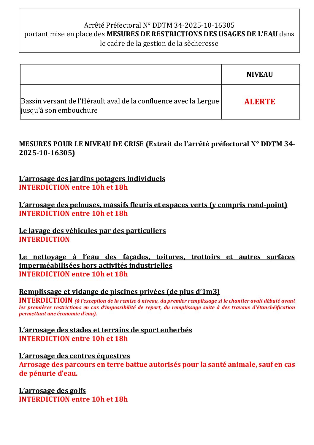 Arrêté préfectoral N°DDTM 34-2025-10-16305 – Portant mise en place des MESURES DE RESTRICTIONS DES USAGES DE L’EAU